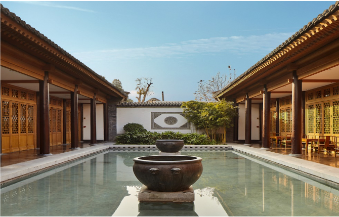 Отель возведен в традиционном китайском стиле «сыхэюань» - черепичные крыши, колонны, резные ширмы. Номера расположены в отдельных павильонах. На территории отеля растут фруктовые деревья и создан искусственный пруд.